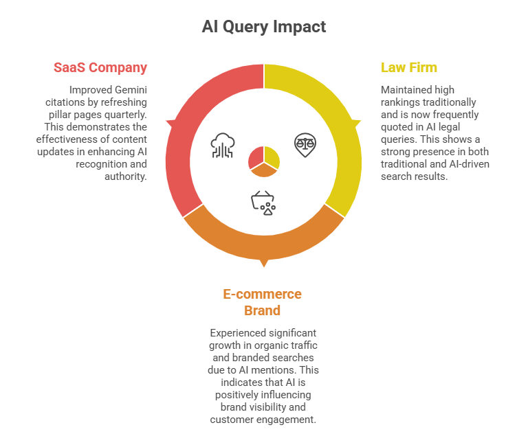 • Law firm → kept #1–3 rankings (traditional) + now quoted in 71% of AI legal queries in their state (GEO)